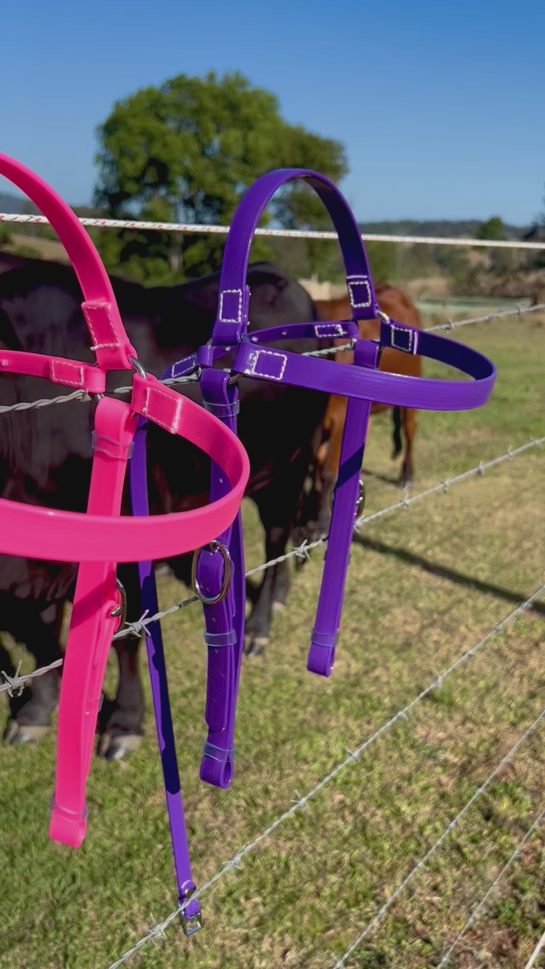 Available in Pink, Purple, Blue, Green, Black, Brown, Yellow and Red! These bridles are made from high-quality, weather-resistant PVC webbing. Perfect for everyday use, rain or shine.